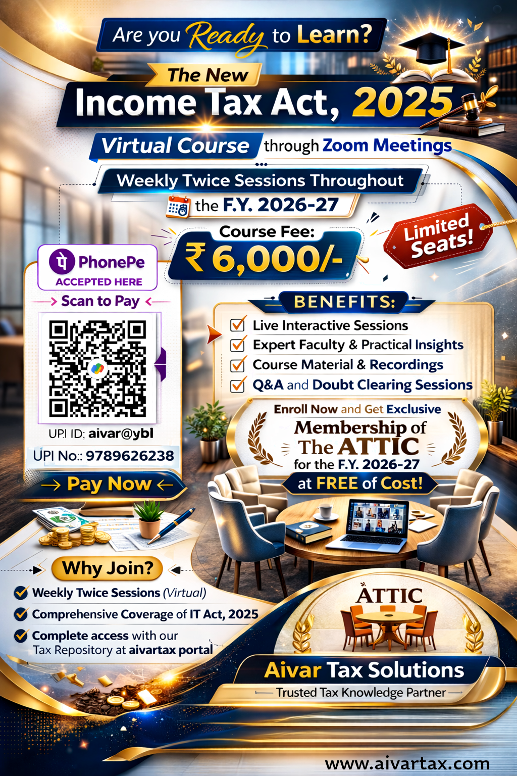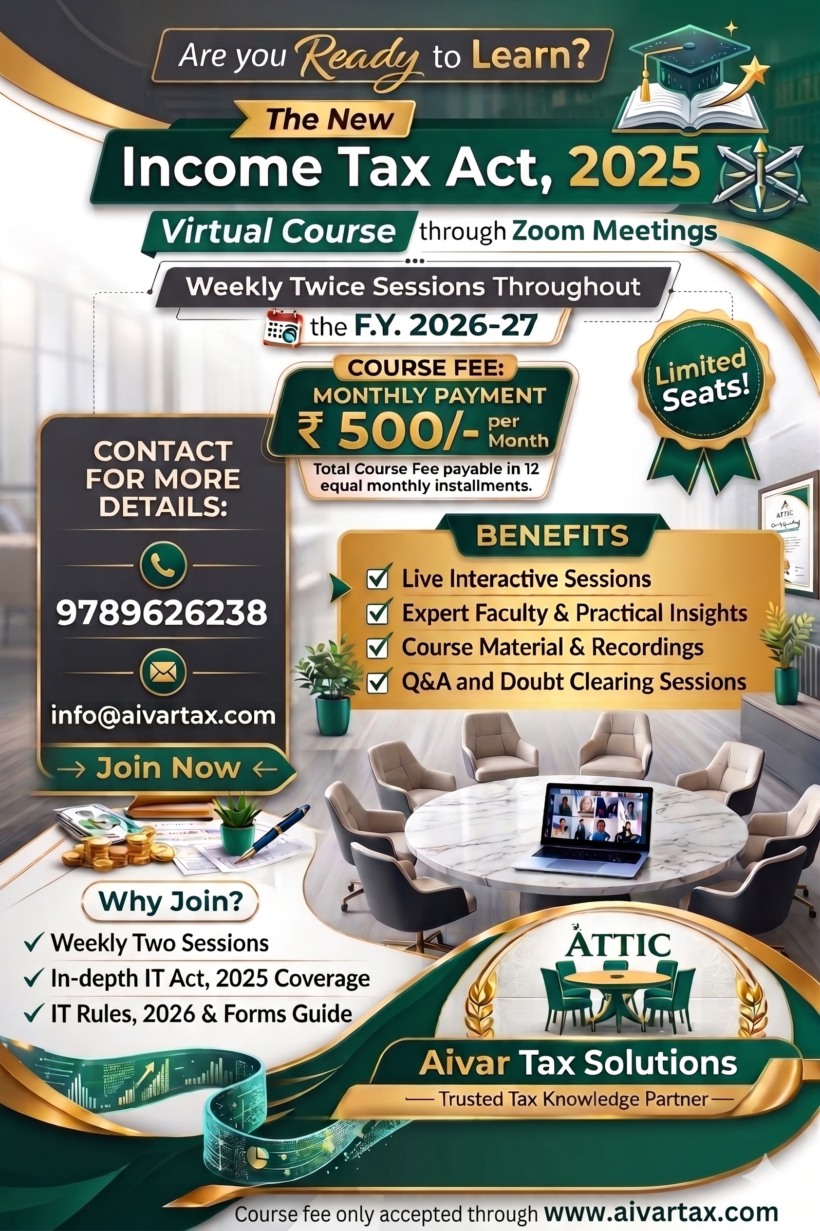 Know MoreWeekly Two Session throughout the F.Y. 2026-27 on Income Tax Act, 2025 & its related Rules, Forms etc.,
